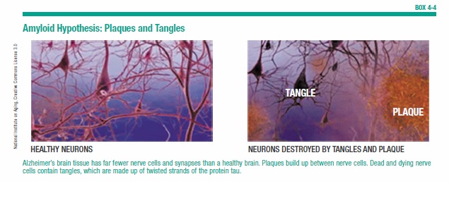 The amyloid hypothesis suggests that toxic beta-amyloid plaques somehow initiate the brain cell destruction observed in AD. The brain normally produces and then eliminates amyloid protein fragments. But in AD, the brain does not remove beta-amyloid proteins. Instead, this protein accumulates and forms sticky masses, or plaques, which destroy neurons and cause the gradual loss of brain tissue (see Box 4-4, “Amyloid Hypothesis: Plaques and Tangles”).