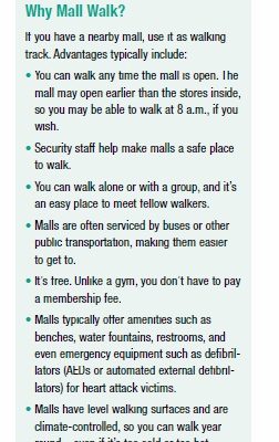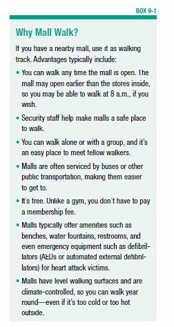 ➧ Shopping malls are a great place to walk. See Box 9-1, “Why Mall Walk?” for a list of advantages of mall walking. If your local mall doesn’t have a formal mall walking program but you’re interested in helping start one, read Mall Walking: A Program Resource Guide, which is available at: cdc.gov/physicalactivity/downloads/mallwalking-guide.pdf.