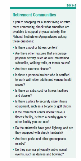 ➧ Senior living (retirement) communities may offer physical activity opportunities for residents (see Box 9-2, “Retirement Communities”).