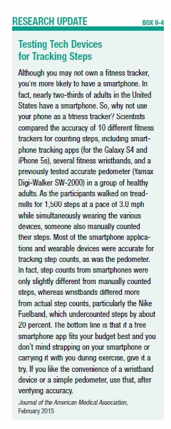 (www.pacer.cc), Moves (moves-app.com), or Accupedo (accupedo.com). A recent study compared the accuracy of dedicated fitness trackers versus smartphone fitness apps for counting steps (see Box 9-4, “Testing Tech Devices for Tracking Steps”) and suggests smartphone apps can be a good choice. Because technology changes quickly, check for the latest reviews on whatever device or smartphone app you’re considering. Many reviews are available online, and computer magazines sometimes have reviews, as do magazines such as Consumer Reports and Time, which often are available at libraries.