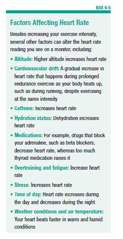 A heart rate monitor helps you keep tabs on your exercise intensity without the need to stop and take your pulse, as (discussed in Chapter 2, page 18). The most accurate heart rate monitors have a chest strap that detects your pulse and sends data to a wrist-watch style receiver, so you can keep an eye on your heart rate during exercise. Strapless heart rate monitors simply use a sensor built into a wristband that tracks your pulse, which can be more comfortable but isn’t as accurate. You can wear a heart rate monitor during most physical activities such has walking, biking, and yardwork. Some models can be worn during swimming. Many monitors have extra features, such as a watch, stopwatch, memory, and a backlight, which can increase price. If you’re considering purchasing a heart rate monitor, it’s important to realize that many factors can affect heart rate and the reading you’ll see, as discussed in Box 9-5, “Factors Affecting Heart Rate.”