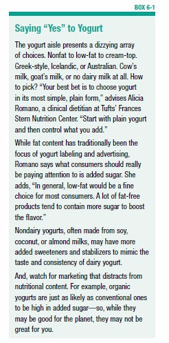 Some yogurt products also contain high amounts of added sugars, making them nutritionally more like a dessert than a healthy choice. Check the Nutrition Facts panel first: A 6-ounce container of plain, low-fat yogurt contains about 12 grams of natural sugars (from the lactose in milk), and the same serving size of plain, low-fat Greek yogurt contains about 6 grams, so numbers much higher than those indicate added sweeteners, which you can identify by checking the ingredients list (see Box 6-1, “Saying Yes to Yogurt,” for more tips on choosing the healthiest yogurt). A healthy alternative that’s also kind to your budget is to buy larger containers of plain yogurt and then customize with your own add-ins or toppings, such as fruit, nuts, and/or spices.