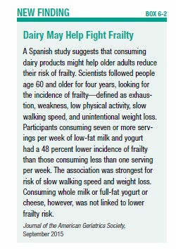 According to the USDA’s ChooseMyPlate, intake of dairy products is linked to improved bone health and may reduce the risk of osteoporosis. Consuming dairy products is also associated with a reduced risk of cardiovascular disease and type 2 diabetes, and with lower blood pressure in adults. Recent research also links low-fat dairy consumption to a reduced risk of frailty (see Box 6-2, “Dairy May Help Fight Frailty”).