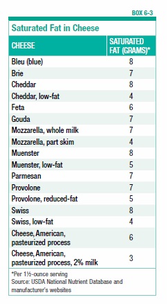The popularity of cheese is undeniable—we use it on burgers, pizza, and sandwiches, in dips and sauces, and with crackers as hors d’oeuvres. Cheese is a good source of protein (6 to 8 grams per serving in most varieties) and calcium (most varieties provide between 200 and 450 milligrams per serving). However, if you eat regular, full-fat cheese, be mindful that one serving can eat up about 50 percent of your total recommended daily amount of saturated fat—just 16 grams for a 2,000-calorie-per-day diet, according to the American Heart Association. Most regular cheeses contain between 7 and 8 grams of saturated fat per one-and-a-half-ounce serving (see Box 6-3, “Saturated Fat in Cheese”). If you eat cheese often, opt for reduced- or low-fat cheeses, which contain 25 to 70 percent less saturated fat than full-fat versions.