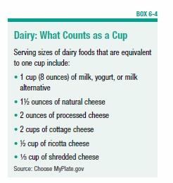 How much dairy do you need? Adult men and women of any age should aim for three cups of dairy or the equivalent per day (see Box 6-4, “Dairy: What Counts as a Cup”).