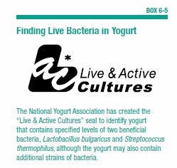 A trade group, the National Yogurt Association, has created a “Live & Active Cultures” seal (see Box 6-5, “Finding Live Bacteria in Yogurt”) to identify products that meet a certain threshold of the two bacteria required by the FDA. If your yogurt’s label doesn’t have this logo, it may still contain live cultures; look for names of bacteria in the ingredients list, or a blurb on the label that says something about live and/or active cultures.