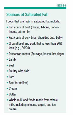 To trim foods from your diet that are high in saturated fat, see Box 8-1, “Sources of Saturated Fat.” Which foods provide the most saturated fat in the American diet? According to research conducted by the National Cancer Institute, these 10 foods contribute more than 50 percent of the saturated fat consumed in the US: