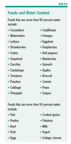 You may not think of food as a primary source of water, but foods may provide up to about 22 percent of the average American’s water intake; see Box 9-2, “Foods and Water Content,” for foods that provide plenty of fluids.