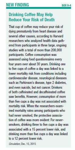 Drinking coffee has also been associated with a wide range of health benefits—so much so that the latest 2015-2020 Dietary Guidelines for Americans mention coffee specifically. The guidelines followed evidence that drinking three to five eight-ounce cups a day (up to about 400 milligrams of caffeine) was associated with minimal health risks and possible benefits. The ink was barely dry on that advice when another study reported that people who drink up to five cups a day have a lower mortality risk (see Box 9-4, “Drinking Coffee May Help Reduce Your Risk of Death”).