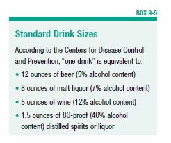 The latest Dietary Guidelines for Americans advises women who choose to drink alcoholic beverages to limit intake to one glass a day and men to stop at two drinks (see Box 9-5, “Standard Drink Sizes”). Overdoing it has health consequences including liver damage and increased cancer risk, as well as social, psychological, and legal risks.