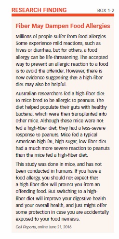 The importance of fiber in the diet cannot be overemphasized. Dietary fiber—what we used to call “roughage” or “bulk”—can help prevent or alleviate chronic constipation, hemorrhoids, diverticulosis, irritable bowel syndrome, and possibly colorectal cancer. There is new evidence a high-fiber diet may lessen or prevent food allergies (see Box 1-2, “Fiber May Dampen Food Allergies,” on page 10).