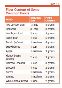 Foods that are high in fiber are listed in Box 1-3, “High-Fiber Foods,” and the fiber content (in grams) of some common foods is listed in Box 1-4, “Fiber Content of Some Common Foods.”