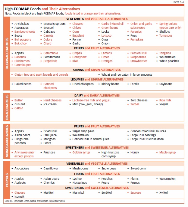 Not everyone reacts to all FODMAPs, and some people can consume small amounts of a FODMAP without experiencing symptoms. A diet in which all FODMAPs are eliminated for two to four weeks, then slowly reintroduced one by one over six to eight weeks, can reveal which foods trigger the reaction. The good news is that avoiding the offending food improves symptoms and restores quality of life in up to 70 percent of patients with irritable bowel syndrome (see Box 1-6, “High-FODMAP Foods and Their Alternatives,” on page 13).
