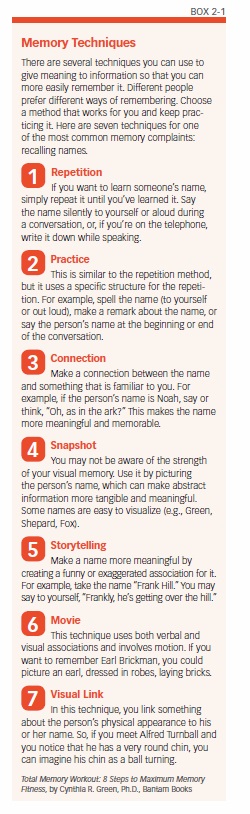 You can learn memory techniques (see Box 2-1, “Memory Techniques”). For example, you can create a story or picture for things you want to remember or say the information out loud. You can also connect new information with something that you already know well.
