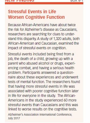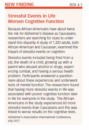 A recent study found that people who experienced a greater number of stressful events in life were more likely to have poorer mental function later in life. The researchers also found that African-Americans in the study experienced over 60 percent more stressful events than Caucasians (see Box 4-1, “Stressful Events in Life Worsen Cognitive Function”).