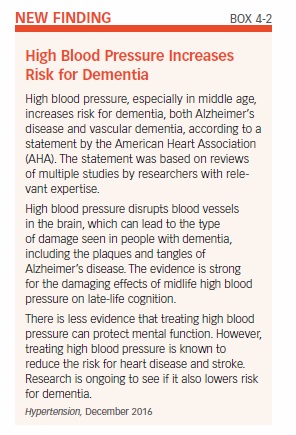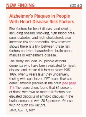Based on a review of several studies, the American Heart Association warned that high blood pressure, especially in middle age, raises risk of dementia later in life (see Box 4-2, “High Blood Pressure Increases Risk for Dementia”). Another study found that having heart disease risk factors increases the chances of having deposits of amyloid plaques in the brain, which is the hallmark feature of Alzheimer’s disease (see Box 4-3, “Alzheimer’s Plaques in People With Heart Disease Risk Factors”).