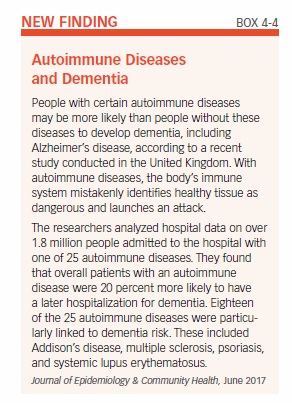 In addition to these risk factors, suffering a moderate or severe head injury increases the risk for Alzheimer’s disease and other dementias. Some evidence suggests that anemia, a condition in which the number of red blood cells is lower than normal, may also be linked to a higher chance of getting Alzheimer’s disease. A recent study found a possible link between certain autoimmune diseases and dementia, including Alzheimer’s disease (see Box 4-4, “Autoimmune Diseases and Dementia”).