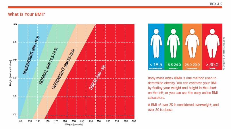 Obesity, a heart disease risk factor, has been shown to increase the risk for developing Alzheimer’s disease. Obesity is defined as having a body mass index (BMI) greater than 30 (see Box 4-5, “What is your BMI?” on page 31). Numerous BMI calculators are available online, including one from the National Heart, Lung, and Blood Institute (https://tinyurl.com/ydx44jgn). Studies have shown that obesity in midlife may raise the chances for dementia later in life. In addition, the location of the excess weight in the body may be as important as simply being overweight. One study found that people with a large belly in their 40s have increased risk for developing dementia in their 70s. Even those who were of normal weight but had large abdomens were at greater risk than those of normal weight with smaller waists. Obesity plus a large belly resulted in the highest risk, about 3.6 times greater than people of normal weight with smaller waists.