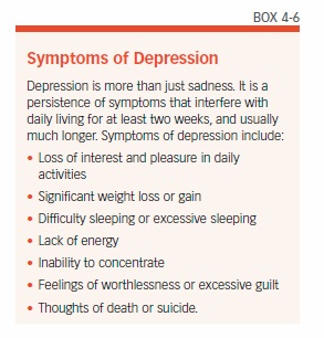 About 20 percent of older adults suffer with depression. Signs of this emotional disorder are listed in Box 4-6, “Symptoms of Depression.” Several studies have concluded that depression increases the risk for developing Alzheimer’s disease. However, not all studies have found this link. In addition, there are several unanswered questions, such as whether it matters if depression is major or minor. Also, does it make a difference if depression occurs in early, middle, or late life? It appears from a few studies that depression in later life is most strongly related to increased risk for mental decline and Alzheimer’s disease.