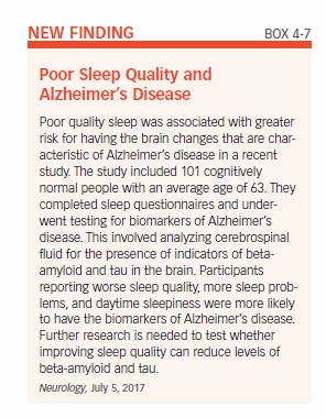A recent study connected poor sleep in people around age 63 with the presence of biomarkers of Alzheimer’s disease in their brains (see Box 4-7, “Poor Sleep Quality and Alzheimer’s Disease”).