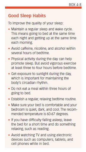Sleep specialists recommend good sleep habits to help fall asleep and stay asleep for the recommended seven hours (see Box 4-8, “Good Sleep Habits”).