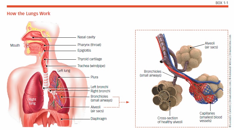 At the end of the bronchioles are clusters of tiny air sacs that look like bunches of grapes. These are called alveoli, and there are millions of them. When you inhale, these sacs expand as they fill with air. When you breathe out, the air sacs deflate. The alveoli have very thin walls, and are surrounded by capillaries (the smallest blood vessels). Where the alveoli and capillaries meet, gas exchange takes place (see Box 1-2, “Exchanging Carbon Dioxide for Oxygen in the Lungs”). Oxygen moves across the walls of the alveoli and enters the tiny capillaries, where it is absorbed into red blood cells. This “oxygenated” blood begins its journey to the heart, and then the rest of the body. At the same time, carbon dioxide from the blood in the capillaries passes into the alveoli. From there, it is expelled from the body through exhalation. This exchange of gases takes just a fraction of a second.