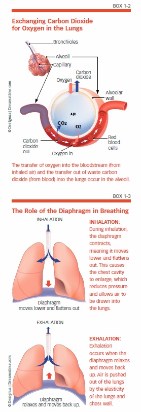 The mechanical process of breathing depends on several muscles, the largest of which is the diaphragm. This dome-shaped muscle is positioned just below the lungs, and separates the chest cavity from the abdomen (see Box 1-3, “The Role of the Diaphragm in Breathing”). During inhalation, the diaphragm flattens out, causing the chest cavity to enlarge. This reduces pressure in the chest cavity and allows air to be drawn into the lungs. When the diaphragm relaxes, air is pushed out of the lungs. Other muscles also are at work during the process of breathing. When these muscles are working most efficiently, more air is pulled into lower lobes of the lung.
