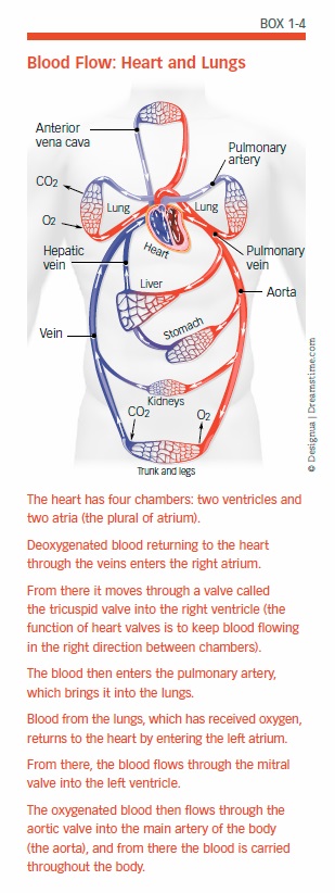 There are two types of blood vessels: Veins carry blood toward the heart, and arteries carry it away from the heart. Arteries bring blood that contains oxygen (oxygenated) to the tissues of the body, and veins carry blood that is void of oxygen (deoxygenated) and full of carbon dioxide back to the heart. Through the heart’s pumping action, blood that has been depleted of oxygen and contains carbon dioxide is sent from the heart into the lungs. Once gas exchange takes place in the lungs, the newly oxygenated blood returns to the heart. From there, the heart pumps the oxygenated blood into the aorta (the main artery) and out into the branching system of smaller and smaller arteries to reach the rest of the body (see Box 1-4, “Blood Flow: Heart and Lungs”).