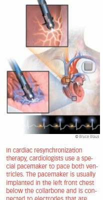 Cardiac resynchronization therapy (CRT) is a method of making the heart’s ventricles contract properly. It involves having a pacemaker implanted. Pacemakers prevent the heart from beating too slowly. They are set at a minimum number of beats per minute, and if the heart rate drops below this level, the pacemaker sends electrical impulses that stimulate the heart to beat faster.