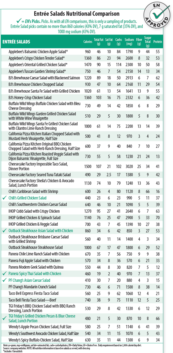 Salads come in various shapes and sizes, from simple side salads to gigantic entrée salads and everything in between. The perception is that salads are automatically healthy. Think about it—they typically provide more vegetables than other common restaurant entrees that are primarily meat and grain or potato. And veggies are one food group many Americans fall short on. Unfortunately, today’s entrée salads also often have extras that, while not negating the benefits of eating more vegetables, provide substantial calories, fat, and sodium. In addition, like most restaurant foods, entrée salad portions are often large enough for two meals, at least.