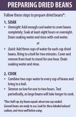 Fiber feeds beneficial gut bacteria, which is good for health, but can create intestinal gas (flatulence). Discarding soaking liquid (or liquid from canned beans) and increasing bean intake slowly can minimize gas production.