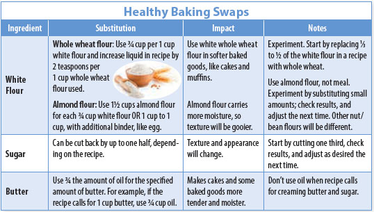 Know Your Enemy: Added sugar is essential in the icing on a cinnamon roll; pound cake is defined by that pound of butter; pie crusts are not flaky without butter or shortening; and baked goods like cookies, brownies, quick breads, and cakes rely on refined flour and added sugars for texture and flavor. Refined white flour, added sugars (including “natural” sugars like honey, agave, and maple syrup), and saturated fats are the foundation of our favorite treats, but excess intake is also a recipe for increased risk of diabetes, heart disease, and obesity. Rather than trying to deny yourself the joys of the season altogether, it’s ok to improve favorite recipes with healthier ingredients, or even enjoy them as they are in moderation.