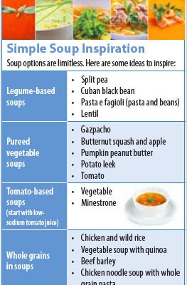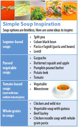 Soups are wonderfully versatile and easy to make, and the combinations of ingredients and flavors are endless. They are a great way to boost your intake of vegetables, legumes, and whole grains, and when you make soups at home you control the sodium level, which tends to be high in canned and packaged varieties.