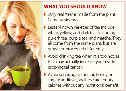All types of tea can be helpful in prevention of skin, lung, breast, esophageal, stomach, colon, and prostate cancer, as well as rheumatoid arthritis. “Polyphenols in teas can improve metabolic syndrome by regulating glucose (sugar) and lipid (fat) metabolism, mildly improve blood pressure, and decrease the risk of stroke,” Cervantes adds. Some people experience nausea with tea on an empty stomach.