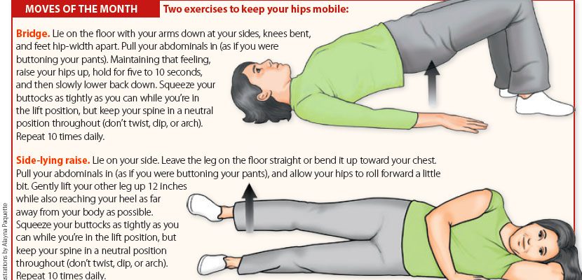 Combine stretching and strength training with walking, swimming, biking, or an elliptical crosstrainer to protect your hips, Popkin advises. “Avoid prolonged deep flexion activities, such as deep squats or deep lunges— as these positions can irritate the hip—and straight leg raises or repetitive hip flexion in patients with hip pain. Also get up and stretch your legs and hips and/or perform hip-strengthening exercises after every 45-60 minutes you sit, to limit stiffness.”