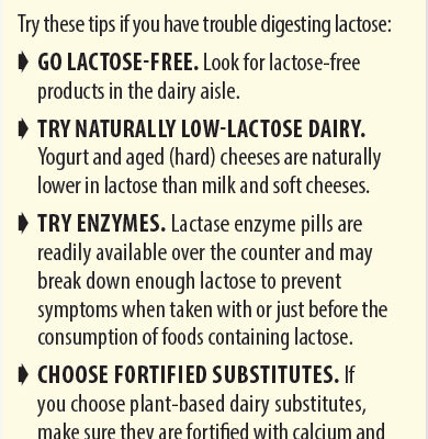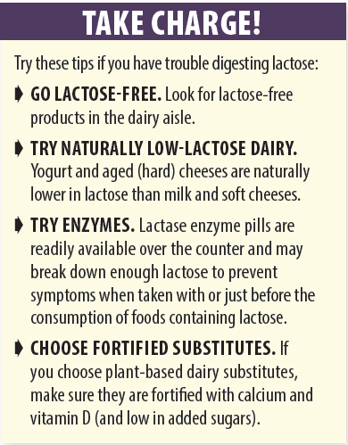 Today’s marketplace is rich in lactosefree milk, yogurt, and other dairy foods. Lactase enzymes have been added to these products to break down most of the lactose into simple sugars. Our taste buds detect of sweetness of these simple sugars more readily than they detect lactose, so these foods may taste slightly sweeter than the standard product. Ingesting lactase enzymes in the form of widely available over-the-counter chewable tablets or capsules is another option. “When taken with or just before the consumption of lactose, lactase enzyme pills may be helpful for preventing symptoms,” says Leung, “although individual results may vary.”