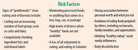 What starts out as a worthy desire to kick a sugar habit or reduce the intake of packaged foods can morph into an unhealthy obsession to rid one’s diet of anything with sweeteners or multiple ingredients. Gradually, eating can become more restrictive to the point where any foods deemed unhealthy or toxic are eliminated. People may constantly only consider the foods with the highest nutritional value and healthiest cooking methods. For example, someone may eat only grass-fed, organic, non-GMO, lowcarb, low-sodium, and non-dairy foods. If they deem the food available to be unhealthy, they may forgo eating.