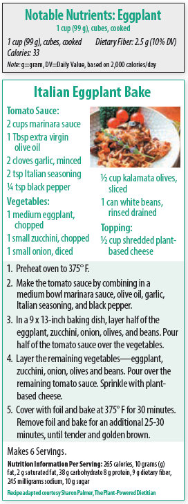 The Findings. The dark hue of eggplants stems from a rich concentration of anthocyanins, known for antioxidant and anti-inflammatory activity. One study suggests anthocyanins may decrease insulin resistance and improve insulin secretion, which is beneficial to people with type 2 diabetes (Advances in Clinical and Experimental Medicine, 2018). Emerging science suggests eggplant may also benefit type 2 diabetes complications, such as dementia and Alzheimer’s disease (Journal of Food Biochemistry, 2019). Daily ingestion of eggplant powder was shown to significantly decrease blood pressure after two to three months (Nutrients, 2019).