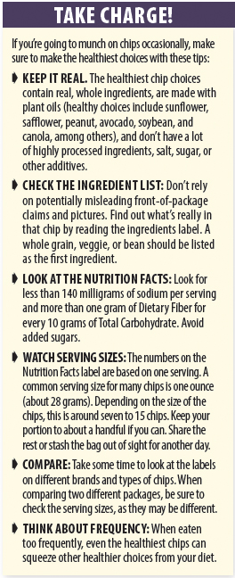 When snacking between meals, it is best to reach for healthy choices like nuts, fruits, veggies, and unsweetened or reduced sugar yogurt. But if you’re looking for a healthier chip, ignore the front-of-package marketing, and flip right to the back. See the Take Charge! box for our tips on making the healthiest choices. Better yet, make chips at home so you can choose your own ingredients. We’ve provided you with two simple recipes to get you started!