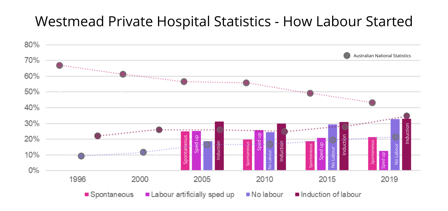 Unfortunately, national statistics do not separate spontaneous labour and labour artificially sped up. So the Australian national statistics combine these two together as spontaneous labour.