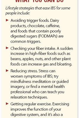 Many studies have shown that a diet low in “FODMAPs” can help relieve IBS symptoms. FODMAPs—fermentable oligosaccharides, disaccharides, monosaccharides, and polyols—are found in many foods. Foods with the highest FODMAP content include garlic, onions, pears, apples, artificial sweeteners, and foods containing lactose (dairy products) and gluten (wheat, barley, and rye). FODMAPs can cause bloating because bacteria in the colon consume them, which produces gas.