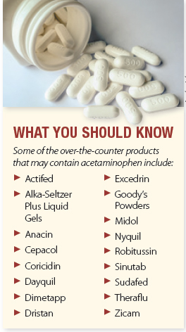 “Your body clears safe doses of acetaminophen, but high doses can cause liver damage,” says Dr. Witkin. “We worry about the cumulative dose patients may be getting without realizing it, since acetaminophen is found in hundreds of OTC and prescription medications. To avoid taking too much acetaminophen, check the labels of all OTC products, especially cold and flu medicines, to see if acetaminophen is an ingredient.” (See What You Should Know for some of the OTC products that contain acetaminophen.)
