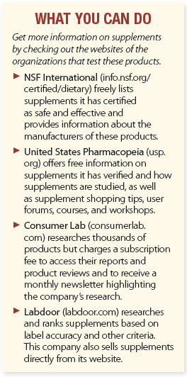 “These organizations test for purity and accuracy of labeling ingredients and doses,” Rosenfeld says. “If the supplement passes their tests, they provide their own stamp of verification on the supplement. However, be aware that some unscrupulous companies may print labels with a near-identical image of these seals of approval.” You can get information on a variety of supplements from the organizations’ websites (see What You Can Do).