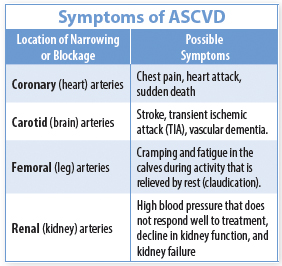 ASCVD is characterized by atherosclerosis, the buildup of plaques in artery walls. These plaques can partially or completely block the flow of blood in the arteries. They can also block blood flow by triggering the formation of blood clots. The consequences of ASCVD depend on where and how quickly the blockage or narrowing occurs (See Symptoms of ASCVD table for more information).