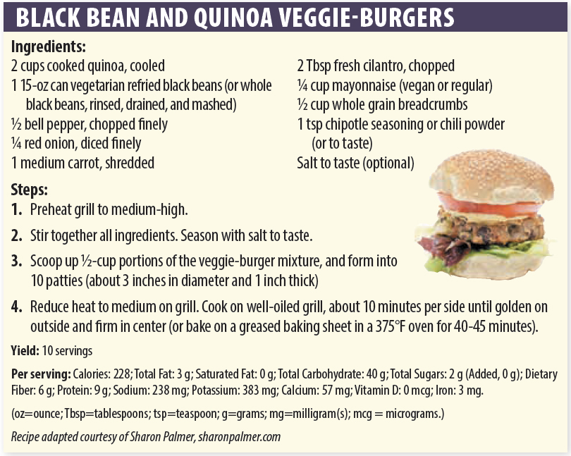 “You can mix up your own batch of veggie-burgers in a jiffy featuring beans, lentils, grains, vegetables, nuts, herbs, and spices,” says Sharon Palmer, RDN, The Plant-Powered Dietitian. “Then top those burgers with your favorite additions, like avocado, lettuce, tomatoes, and onions.” (See Black Bean and Quinoa Veggie-Burgers below.)