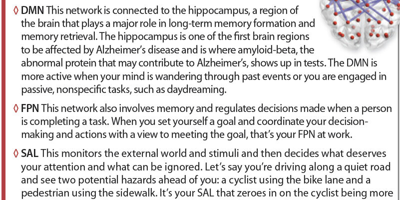 Before the exercise intervention, the participants were asked to read a short story and then repeat it out loud, recalling as many details as possible. They also underwent functional magnetic resonance imaging (fMRI), an imaging technique that tracks changes in blood flow to different regions of the brain. Increases in blood flow indicate which parts of the brain are handling critical functions at any one time. Using fMRI, the researchers measured changes in communication within and between the three brain networks that control cognitive function: the default mode network (DMN), frontoparietal network (FPN), and salience network (SAL)—for more on these, see What You Should Know.