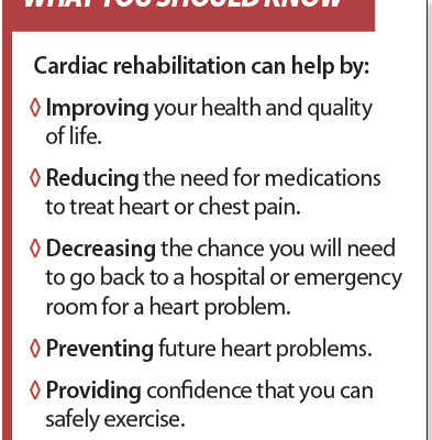 If you smoke, a cardiac rehabilitation program offers counseling to help you quit. Another vital service the programs provide is encouraging medication adherence, which can falter even after a serious cardiovascular event—for example, studies have suggested that one in five people who suffer a heart attack stop taking cholesterol- lowering statins within two years and that nearly two in five often skip the recommended dose of medication. “However, people who take part in cardiac rehabilitation are more likely to regularly take their statins,” Dr. Darrow notes. “This may be due to the fact they are more informed about the purpose of these drugs, and the fact that side effects often don’t persist or can be relieved by adjusting the dosage or substituting an alternative drug.”