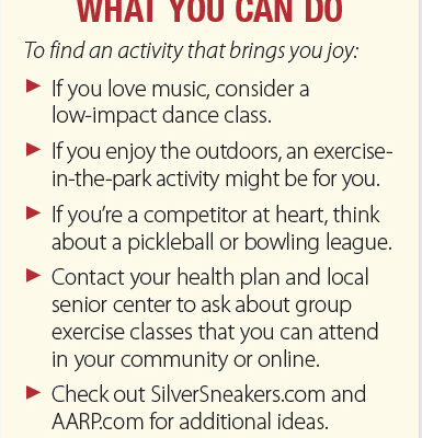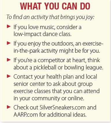 Sometimes exercise is more enjoyable with a friend. If you lack a fitness partner, a community-based program, such as an exercise class at your local senior center or YMCA, can provide the social connection and motivation you need to stick with it. Exercising in a group setting also provides an added layer of safety for people with mobility limitations who can benefit from supervision during activity.