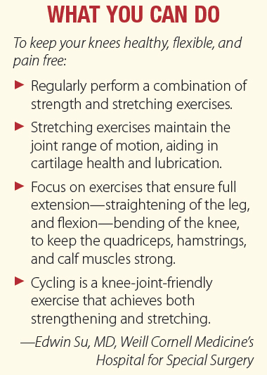 If pain or swelling in the knee occurs with or after activity, it is best to rest the knee to avoid further aggravation. “In addition to rest, icing the knee should help reduce inflammation, and a compressive dressing such as an Ace bandage can help with swelling. Taking NSAIDs such as ibuprofen or naproxen can help bring down pain and swelling more quickly,” says Edwin Su, MD, an orthopaedic surgeon at Weill Cornell Medicine’s Hospital for Special Surgery.