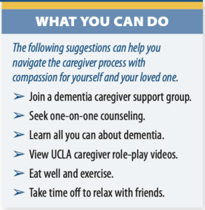 Learning all you can about the trajectory of the disease can help you prepare in many ways, including emotionally and strategically. For example, no one wants to go to a memory care home, but it’s impossible to promise someone that this won’t happen. How can you know when this is truly necessary? How can you choose the best one? What resources might be available to help you keep your loved one at home for a bit longer? What can you do if your loved one becomes aggressive, sexually inappropriate, or refuses to take medications? The caregiver education page on the UCLA website (https://tinyurl.com/UCLACaregiverEd) has a wealth of resources available to answer those concerns and many more.